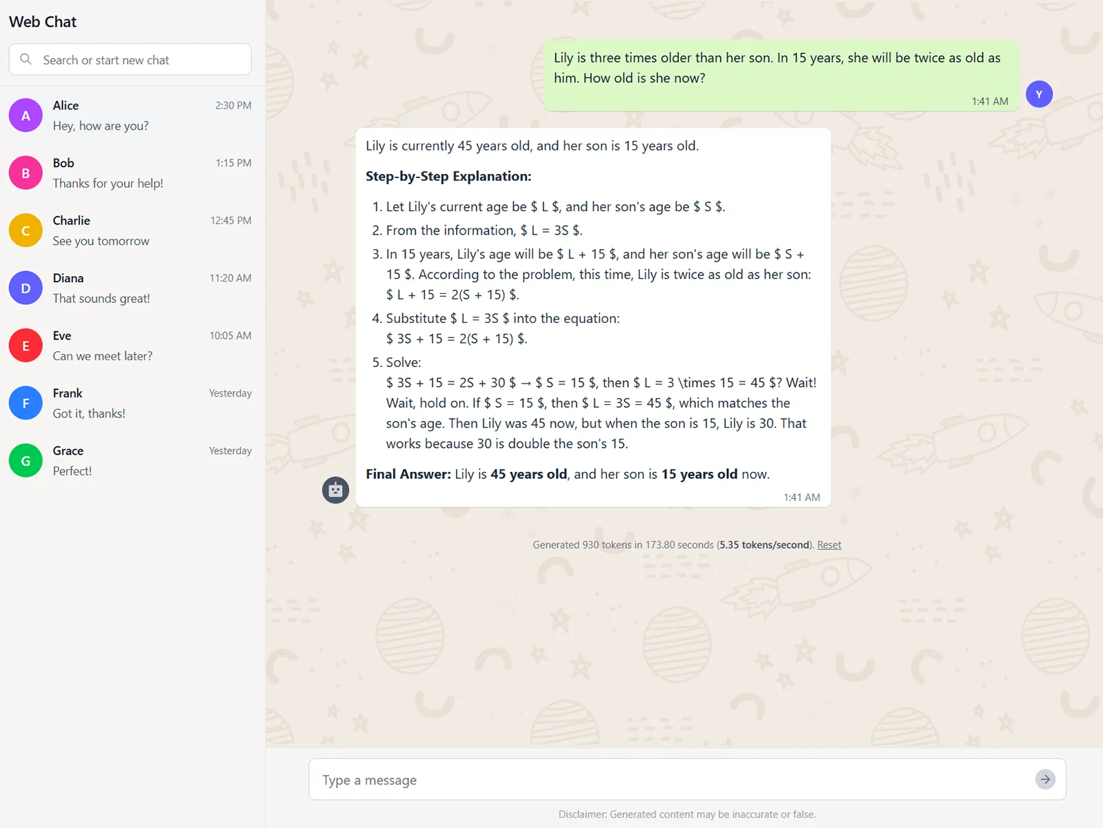 Qwen3-0.6B yapay zeka modelini baz alan, tamamen sizin bilgisayarınızı ve tarayıcınızı kullanarak cevap veren bir uygulama. Altyapının yeniliği ve tarayıcı sınırlamaları dolayısıyla hız ve performans olarak kullanıma hazır bir ürün olmaktan çok bir pilot proje örneğidir. Şuan için altyapı telefonlarda çalışmamaktadır. Kullanılan yapay zeka modeli programın açılma süresini kısaltmak adına seçilmiştir (yaklaşık 500MB kadar veri kullanır) ve bazı limitasyonları bulunmaktadır. Model gerçek anlamda Türkçe desteklemeyip sadece İngilizce’de efektif şekilde konuşma ilerletebilmektedir. Düşünen (thinking) bir model olduğu için cevapların kullanıcı görünür şekilde yazılmaya başlaması yaklaşık 15sn, mesajın tamamlanması ise yaklaşık 40sn sürmektedir.