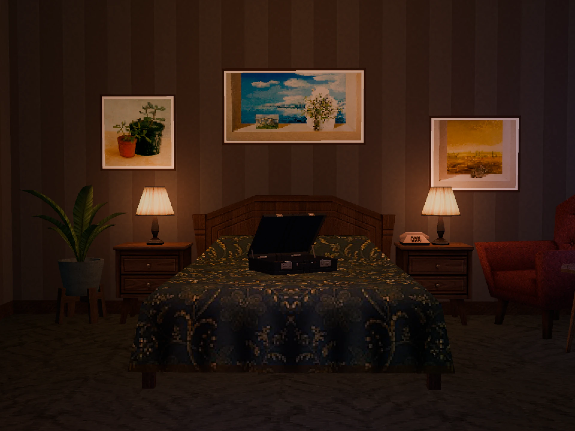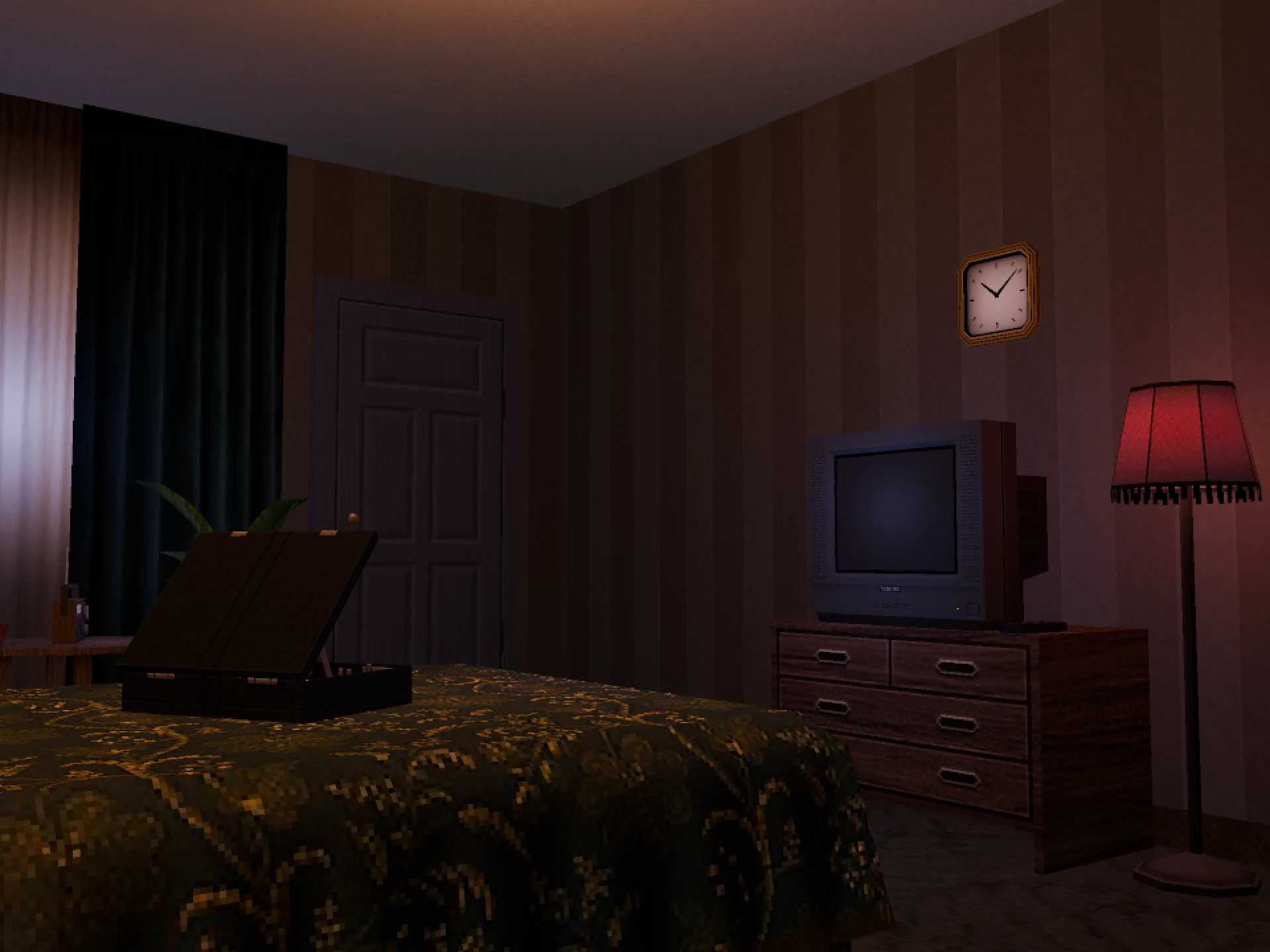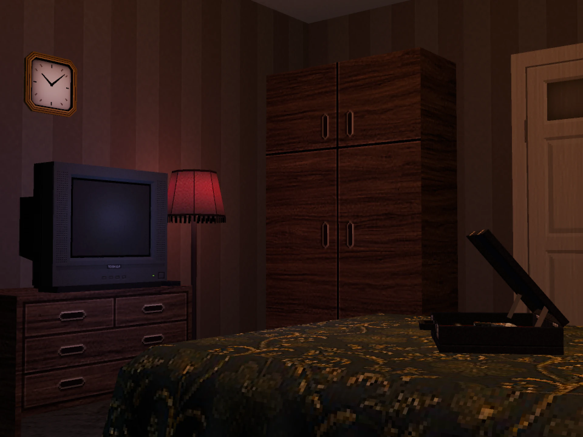 PS1 oyun konsolunun tarzını baz alan bir low poly otel odası sahnesi.