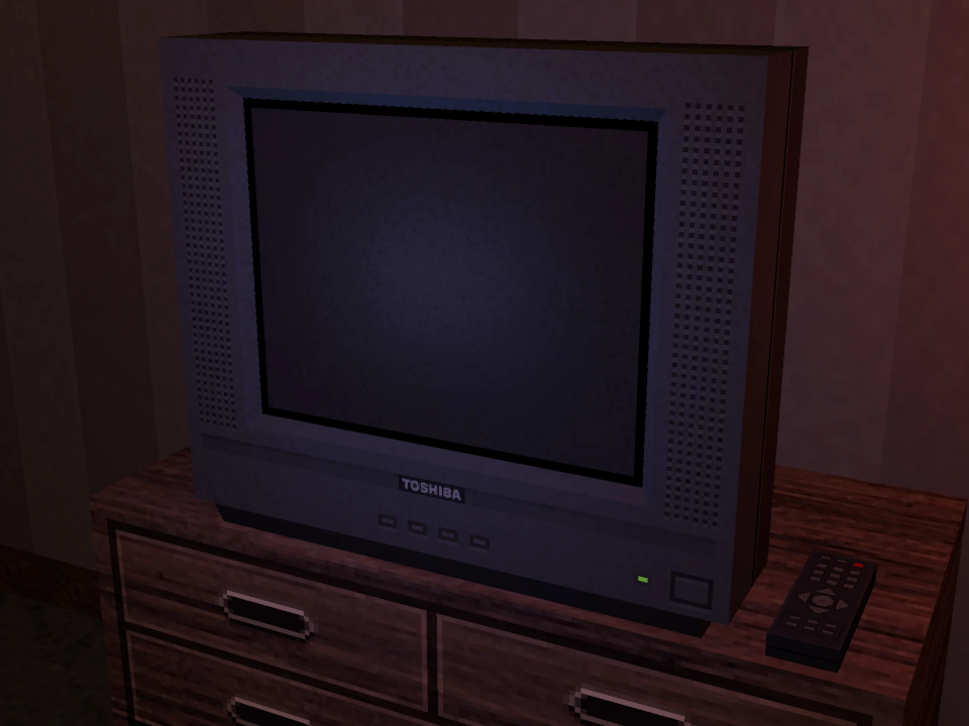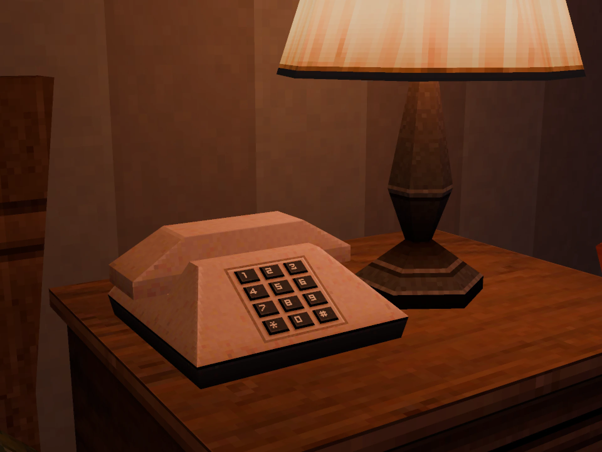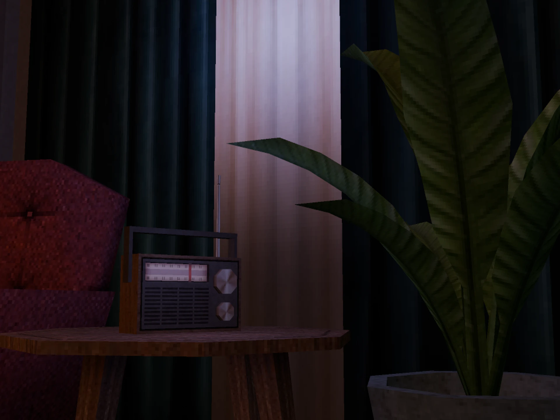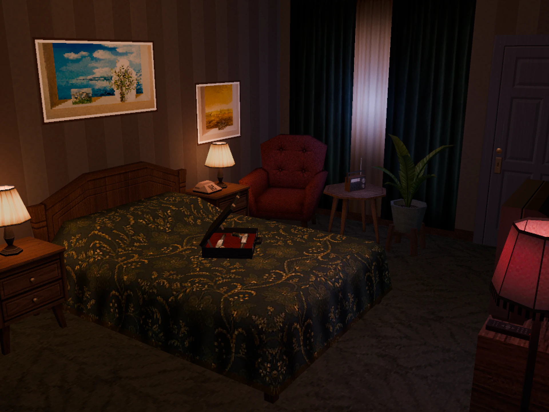 PS1 oyun konsolunun tarzını baz alan bir low poly otel odası sahnesi.