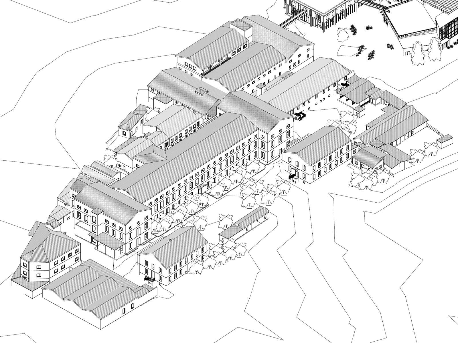 Lisans tezim kapsamında, İzmir’deki Alsancak Tekel Tütün Fabrikası’nın adaptif yeniden kullanımını incelemiştim. Bu çalışmanın bir altlığını oluşturmak üzere, miras alanının korunmasına yönelik devlet rölöve verilerinin yardımıyla fabrika arazisini ve peyzajını Revit’te modelledim.